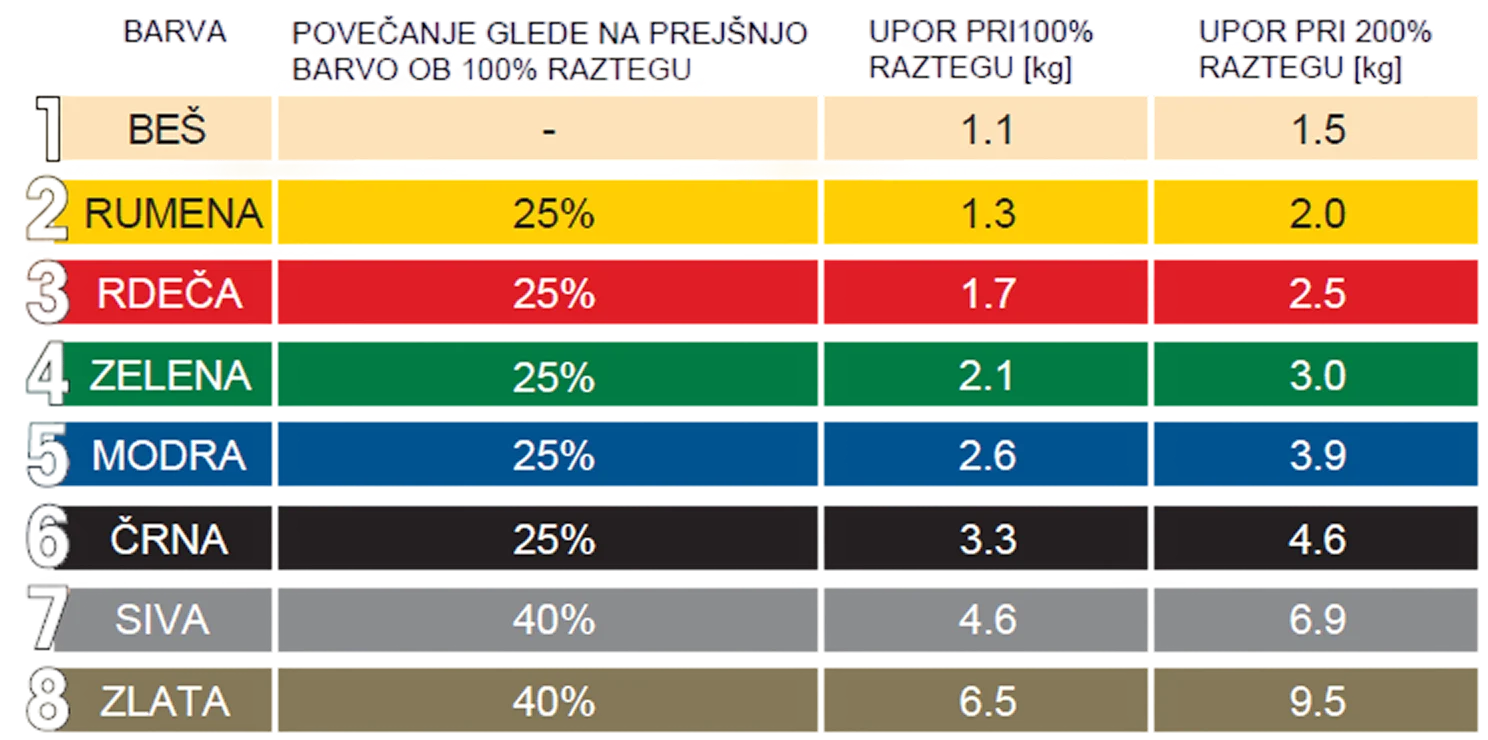 Stopnja upora je odvisna od procentualnega (%) raztega proizvoda. Na primer če raztegnete rdeč elastični trak dolžine 50cm na 100cm, to ustreza 100% raztegu / podaljšanju. Pri tabeli lahko upoštevate moč, ki je potrebna za razteg. Izogibajte se raztegu večjemu od 300%! Uporaba na lastno odgovornost.