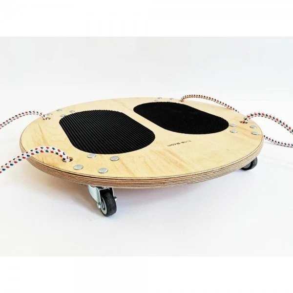 Praviloma ga uporabljamo v paru, pri čemer vadeči skuša vzdržati ravnotežni položaj, medtem ko partner z vlekom izzove kratke nepričakovane premike vozička. Osnovne ploskve ravnotežnih desk so izdelane iz vezane plošče, ki zagotavlja ustrezno trdnost in daje izdelku posebno estetsko vrednost. Za površine, ki so pri vadbi v stiku s podlago, smo izbrali bukov les, ostali del pripomočkov je sestavljen iz segmentno lepljenega smrekovega lesa. Ta sestava daje izdelku večjo obstojnost. Stojna površina je obdana z nedrsečo gumo, ki je enostavna za vzdrževanje. Robovi desk so zaobljeni, vse lesene površine so lakirane s kakovostnim dvokomponentnim lakom. Dimenzija: stojna ploskev ø600 mm Teža: 5,9 kg Pri Tone-Boards ravnotežnih deskah imate na voljo več različnih oblik in težavnostnih stopenj: ravnotežna polkrogla, ravnotežni gibljivi valj, ravnotežna T-deska, ravnotežni polvalj, ravnotežna deska asimetrični konus, ravnotežni voziček. *Dobavni rok je 1 teden